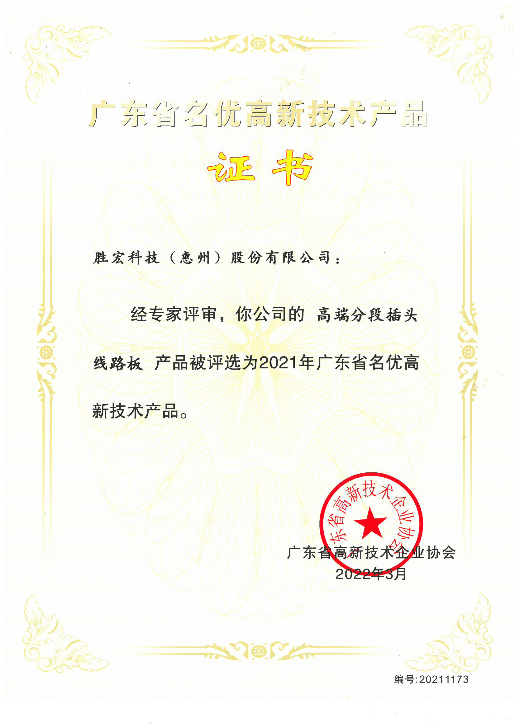 “高端分段插头线路板”名优高新技术产品证书